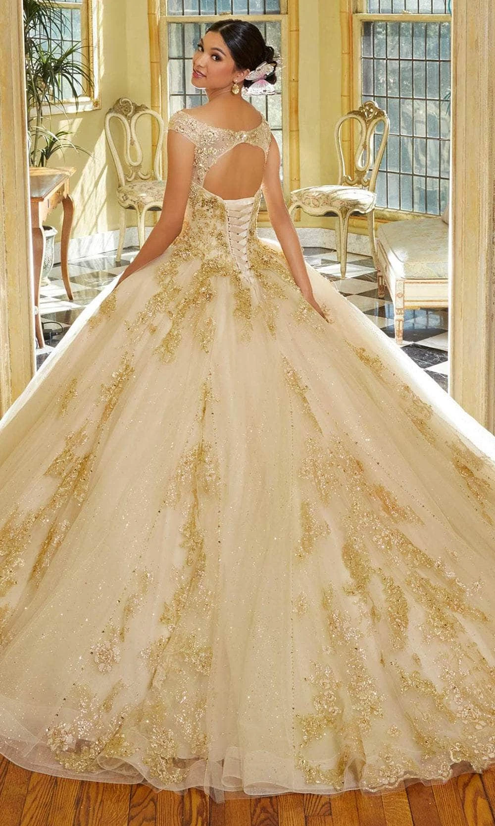 Mesmerize everyone when you cross the ballroom as you wear this Mori Lee 34064 creation. This shimmering Quinceañera dress has a V-neck, off-the-shoulder bodice designed with metallic embroidered appliques and complemented with keyhole back featuring dazzling jewel beading. Lace-up closure at the back ensures a snug fit. The basque waist gives way to the tulle over metallic glitter net ball gown dress that falls to a full length hemline and a sweep train finish. Look your absolute best in this majestic Mori Lee 34064 masterpiece. Model is wearing Emerald/Gold, Champagne colors