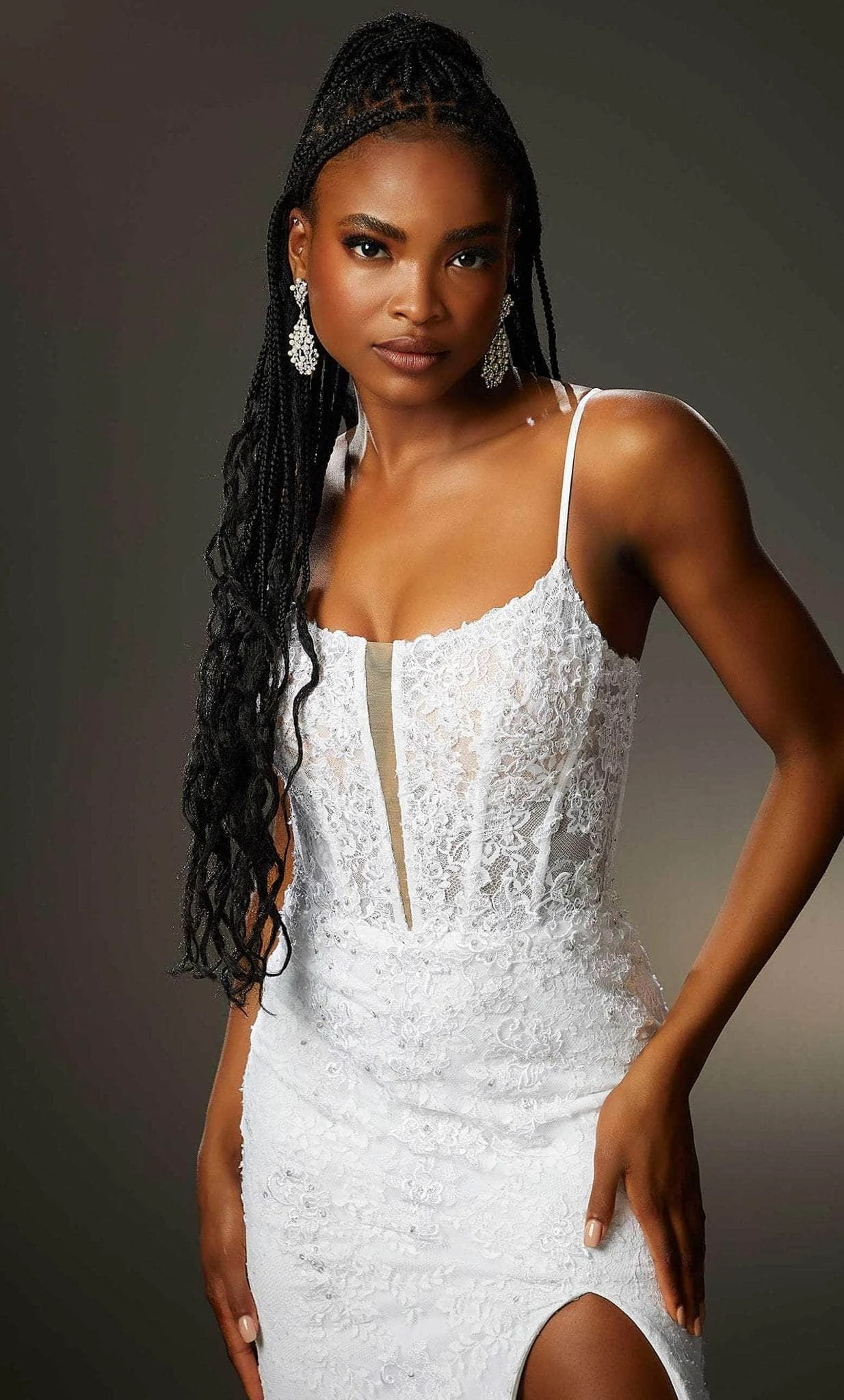 Everyone will be staring at you in this elegant Mori Lee 48044 creation. Glamorously embellished with lace appliques, this beauty features a sleeveless corset boning structure for a figure-flattering style with a sheer inset. The multi-thin straps that support this winning piece lead to a mid-open back with a lace-up tie for a perfect fit it is simply captivating and a zipper at the low back provide security. The skirt features a side slit and parades in a sheath silhouette. Make that special occasion one to remember with this elegant beauty from Mori Lee 48044 masterpiece. Models are wearing White and Black color.