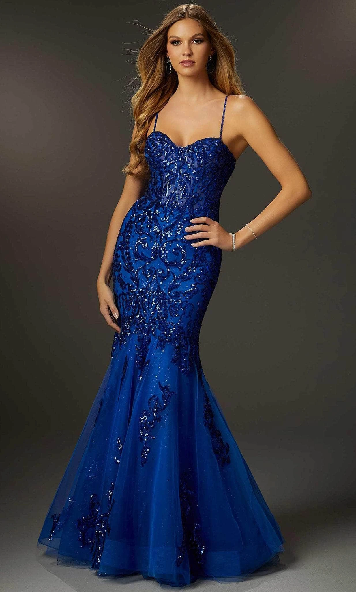 Start your night out right with a stylish creation from Mori Lee 48070. Turn heads in this dazzling sleeveless gown that features a sweetheart neckline and spaghetti straps. From the top to bottom, the fitted bodice is embellished with glimmering sequins and beadwork. The back is styled with an open back giving a hint of your skin and has a lace-up tie closure to ensure a perfect fit. The skirt slims at the thighs before flaring a mermaid silhouette, finished off with a horsehair hem and sweeping train. Dive into a divine event in this luxe Mori Lee 48070 gown. Models are wearing the Emerald, Red and Royal colors.