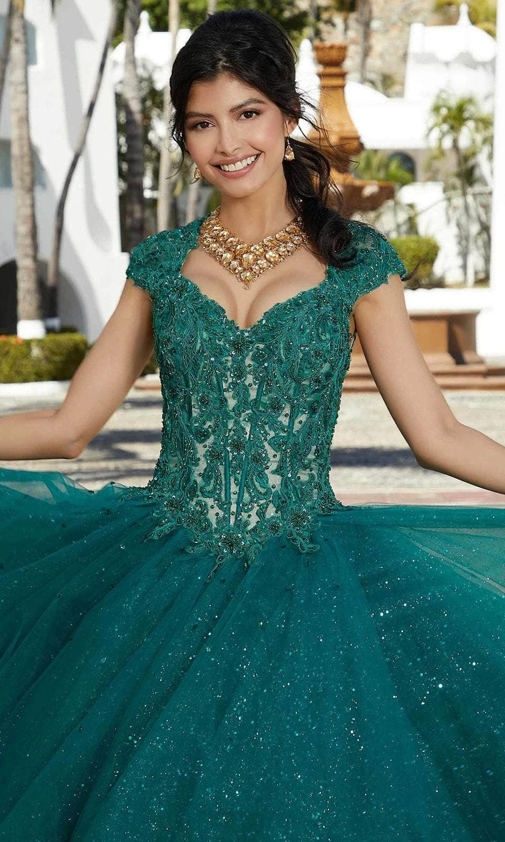 | Details: | Cap Sleeves, Keyhole, Beaded Lace Applique, Ruffled Skirt, Train |
