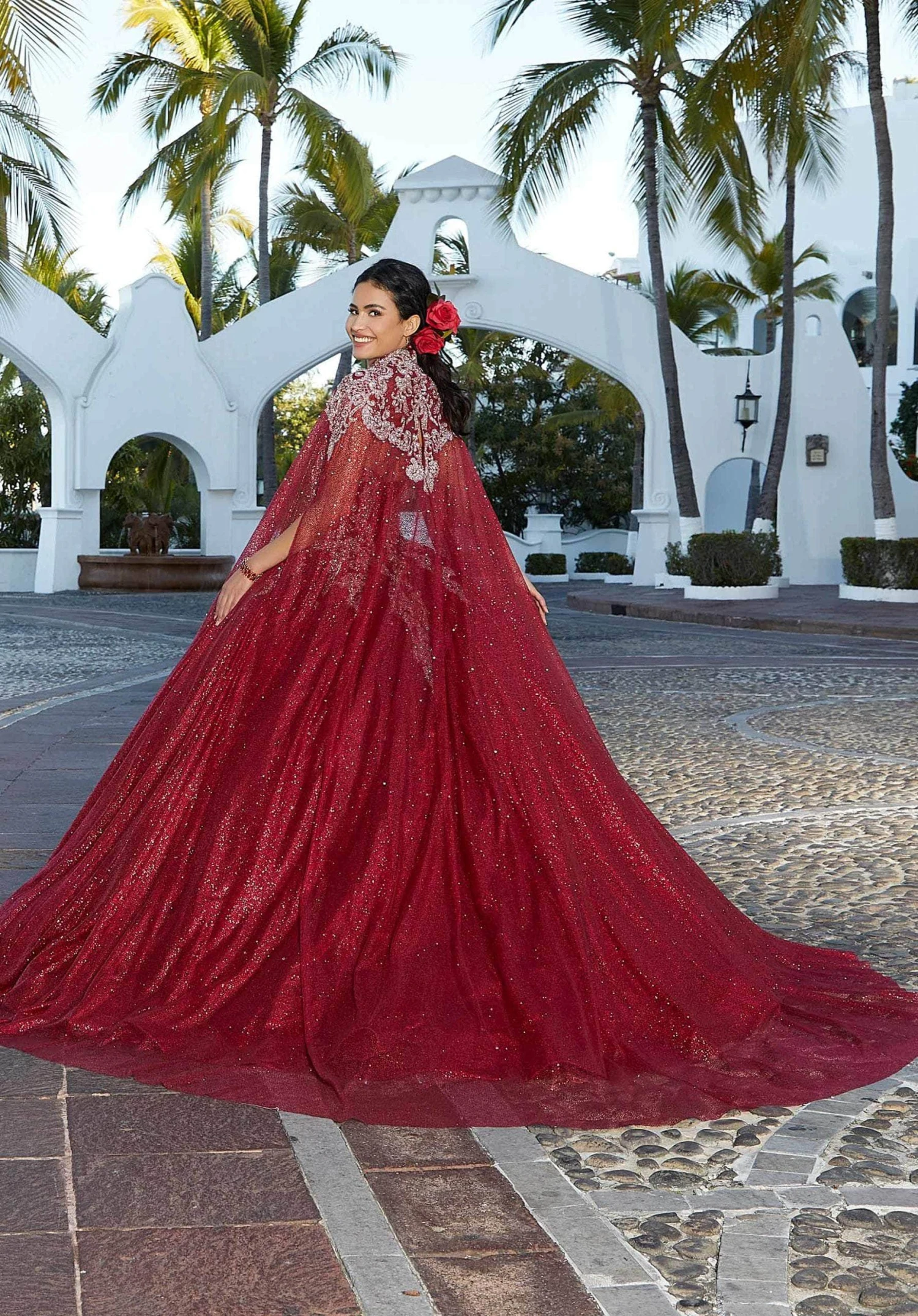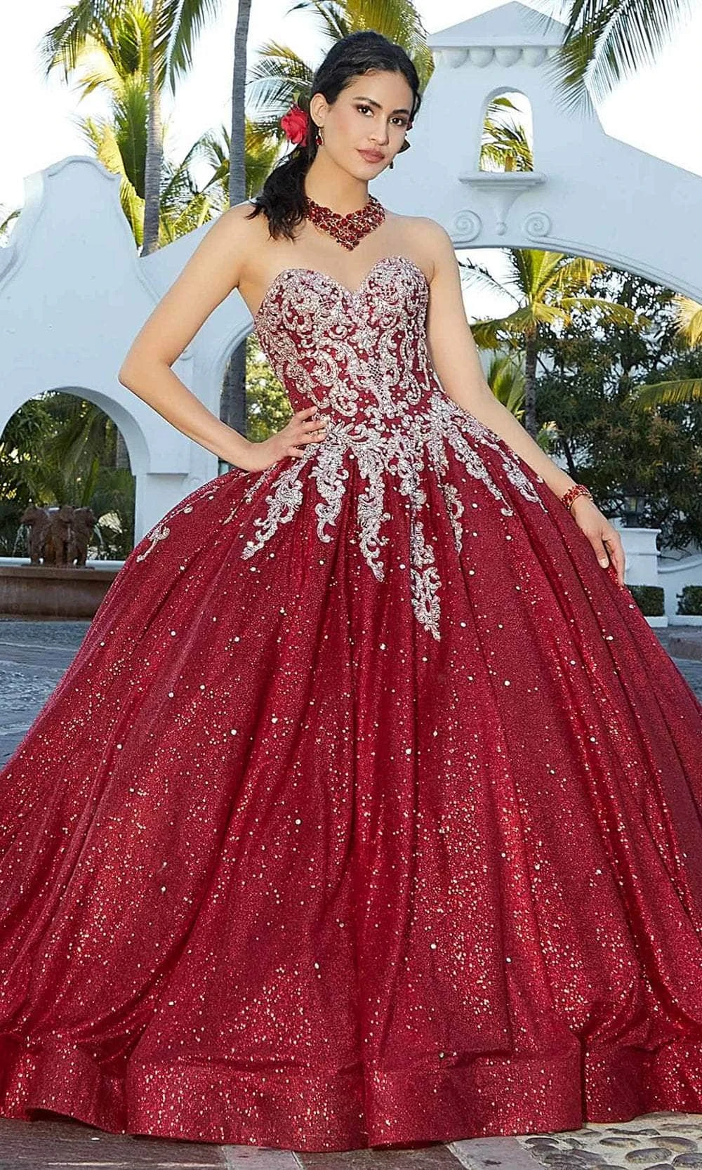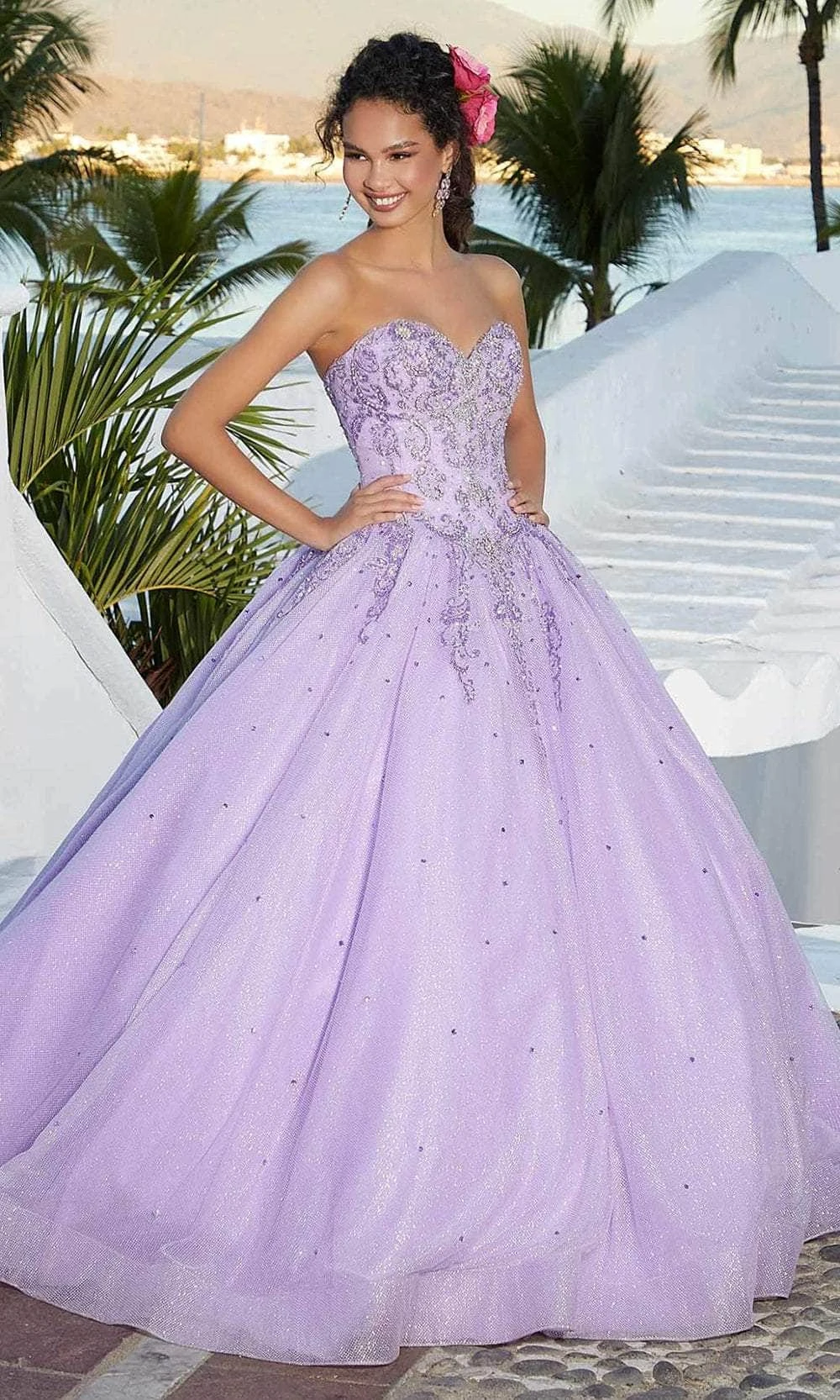 Be a vamp in a captivating gown from Mori Lee 60163 creation. This quinceañera ball gown has a stunning sweetheart bodice designed with cascading crystal beaded. The dress is adorned with glitter embroidery on the full and glitter tulle fabric for a touch of sparkle. This look is finished with a corset back. Included in this set is a stole that is a perfect match for the dress. Sway to the music on your special night in this mellifluous evening set by Mori Lee 60163 masterpiece.