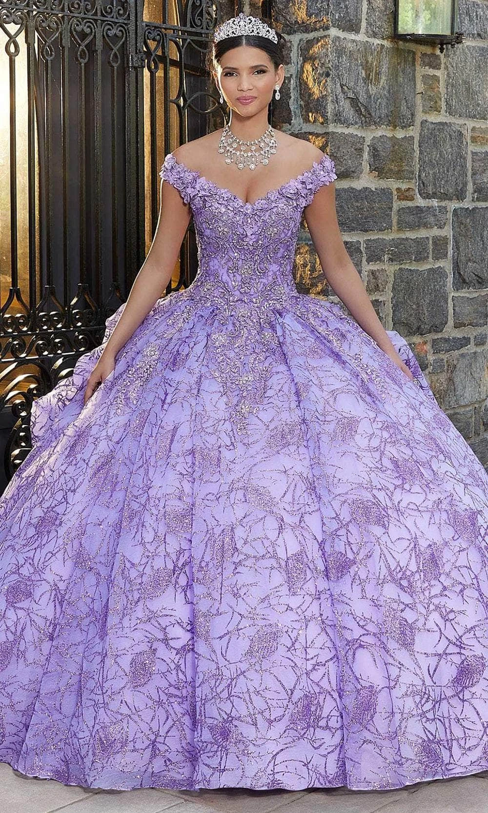 Fantasize a moment of eloquent style as you celebrate in this charming Mori Lee 89335 Quinceanera dress. This stunning patterned glitter ballgown is crafted with metallic embroidered appliques, accented by crystal beading and lavish three dimensional floral details. Features with beautiful V-Neckline, off-shoulder sleeves and a corset style bodice with lace-up back closure. From the basque waistline, a voluminous skirt cascades to the floor with tiered accents at the back creating a dramatic silhouette. This Mori Lee 89335 creation is definitely parades the elegant and classy style fit for a princess! Models are wearing Champagne/Gold and Violet colors