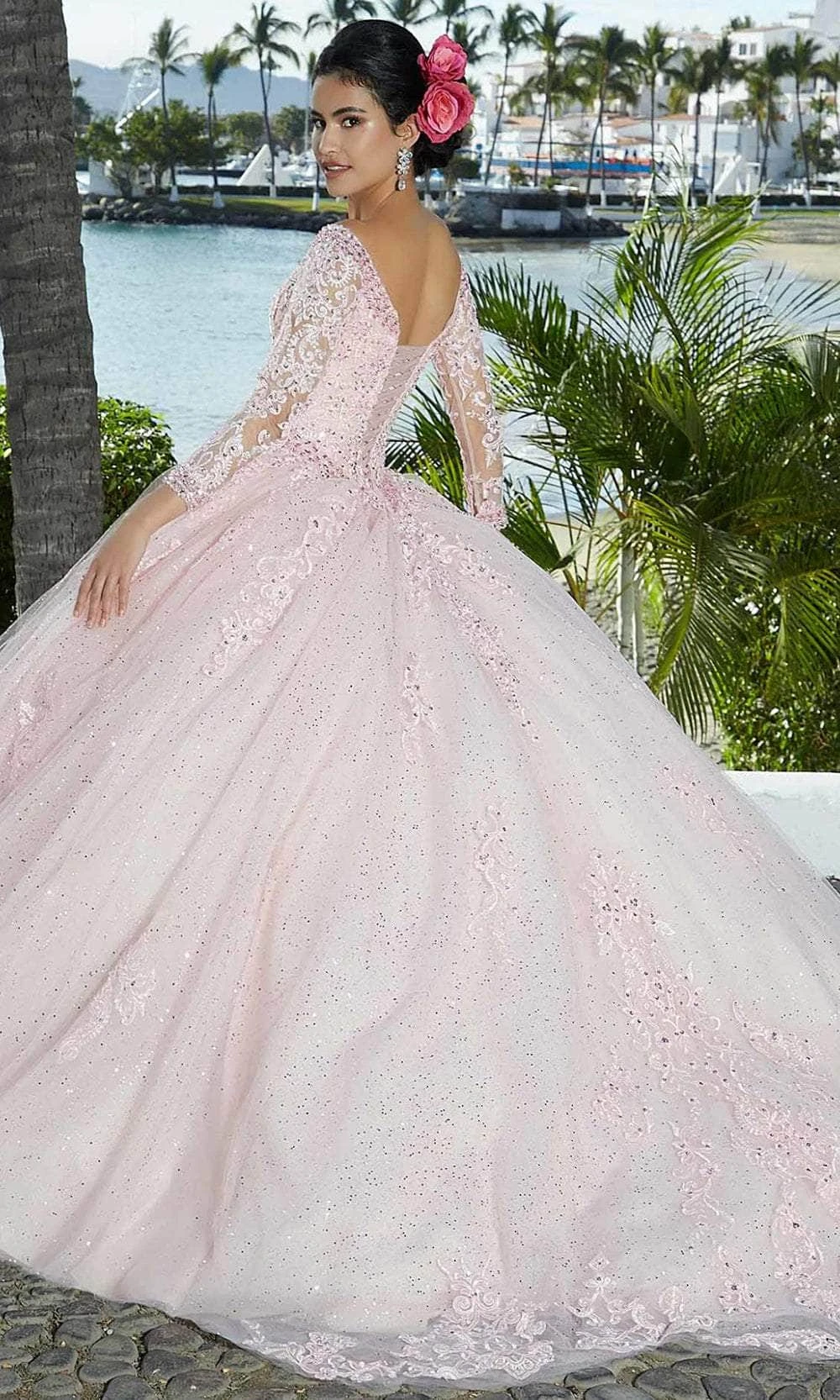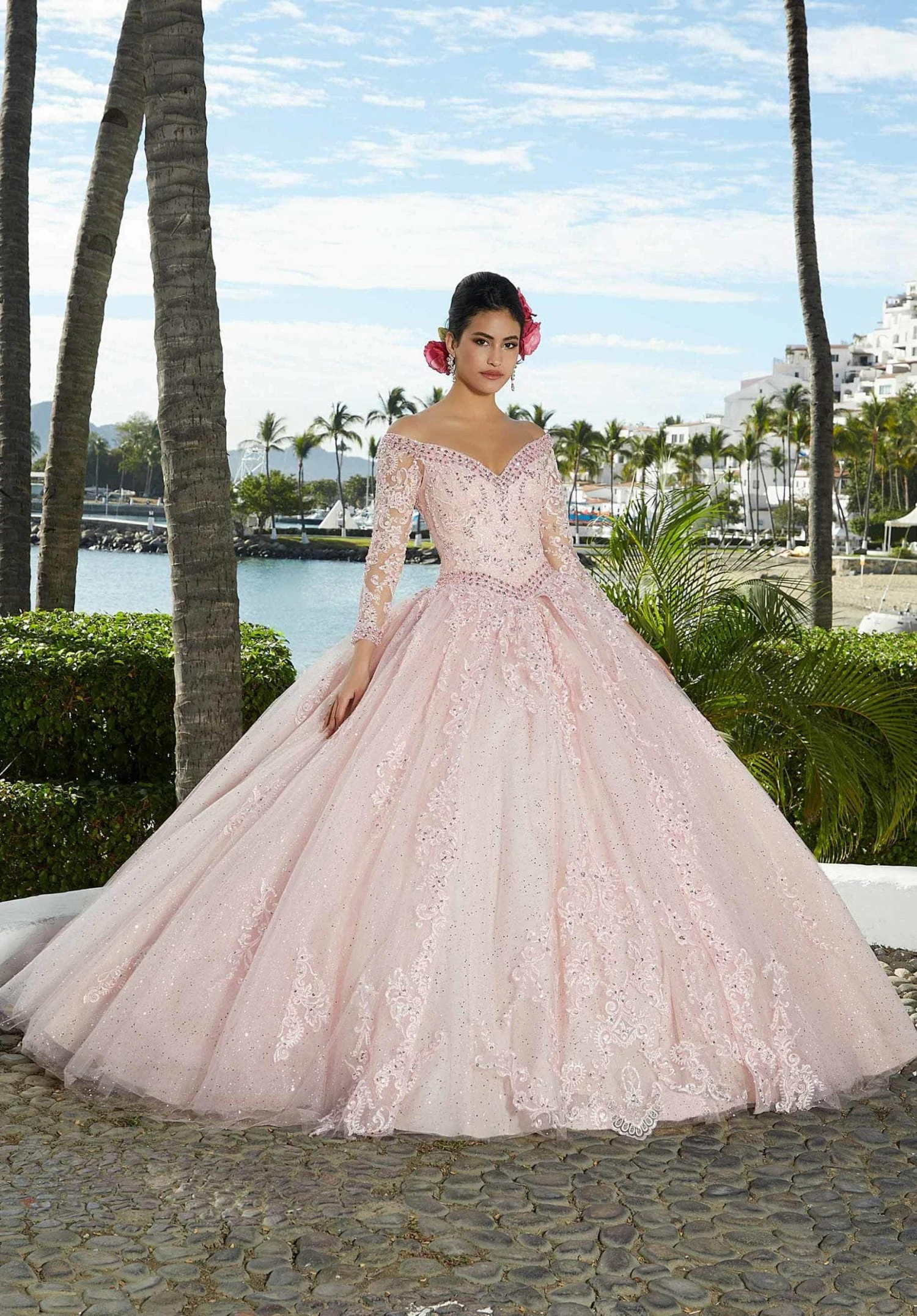 Surround yourself with a sparkle of glamour while wearing this dazzling quinceanera dress from Mori Lee 89360 creation. The bodice of this dress is embellished with crystal beads and applique details and has an off-shoulder neckline with long sleeves. The gorgeous full-length skirt has a shimmering tulle finish and a ball gown silhouette. Be the center of attention in this stunning dress from Mori Lee 89360 creation. Models are wearing Regal/Royal, Blush, and Scarlet colors.