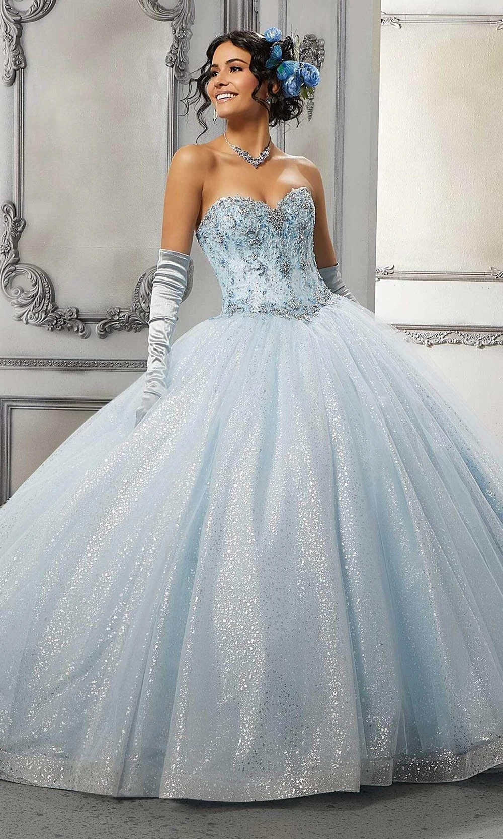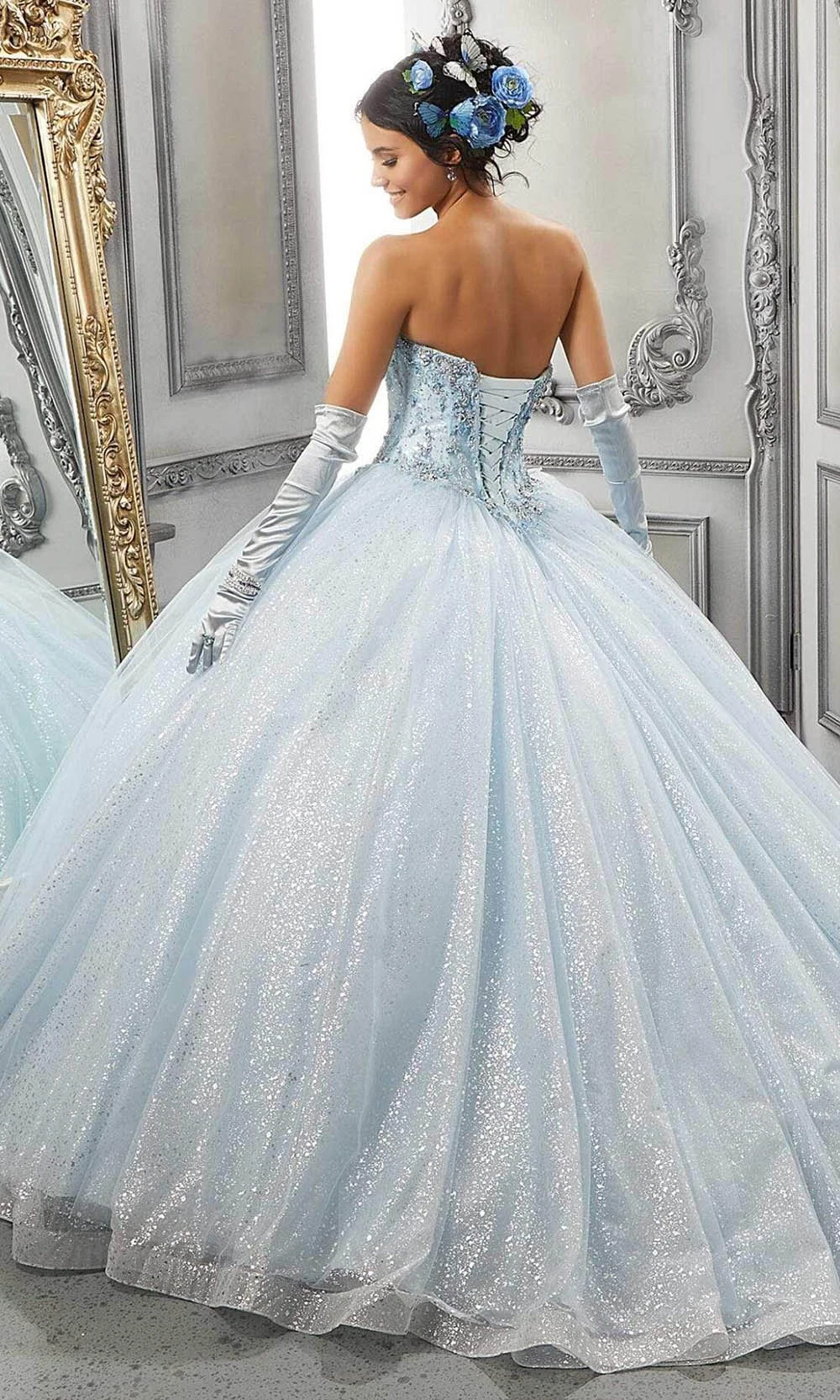 Make your grand entrance in this Vizcaya by Mori Lee 60142 ball gown. This evening gown displays a sweetheart neckline in a beaded and embroidered strapless bodice. Having a basque waistline, this also highlights a mid-open back with lace up back closure. Vizcaya by Mori Lee definitely parades the elegant and classy style. Model is wearing Light Blue color. More colors available. Please call our sales team at 855-700-4239.