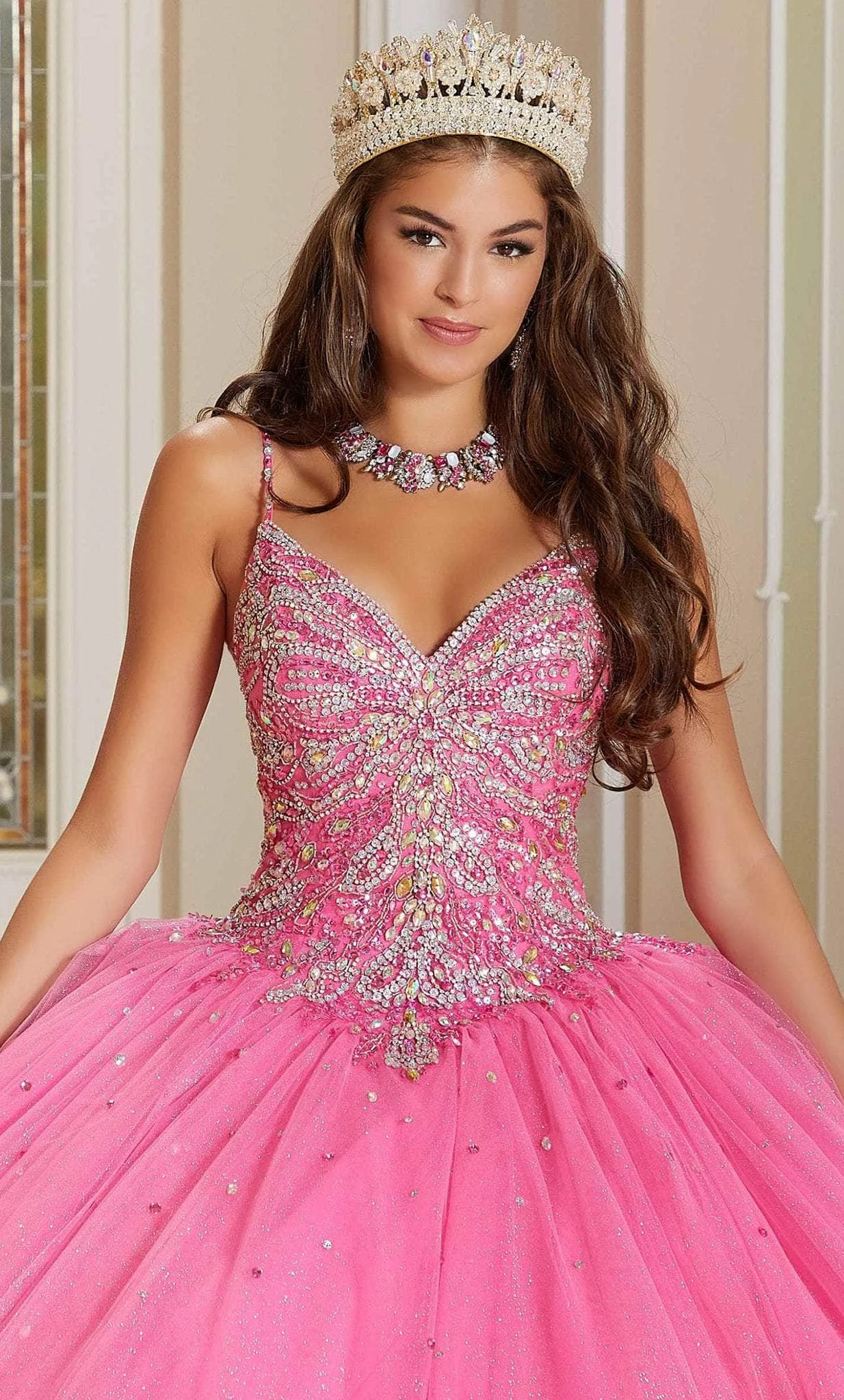 | Details: | Tulle, Sleeveless, Thin straps, Glitters, Rhinestones, Detachable bolero mesh, Mid back, Lace-up tie, Bow back |