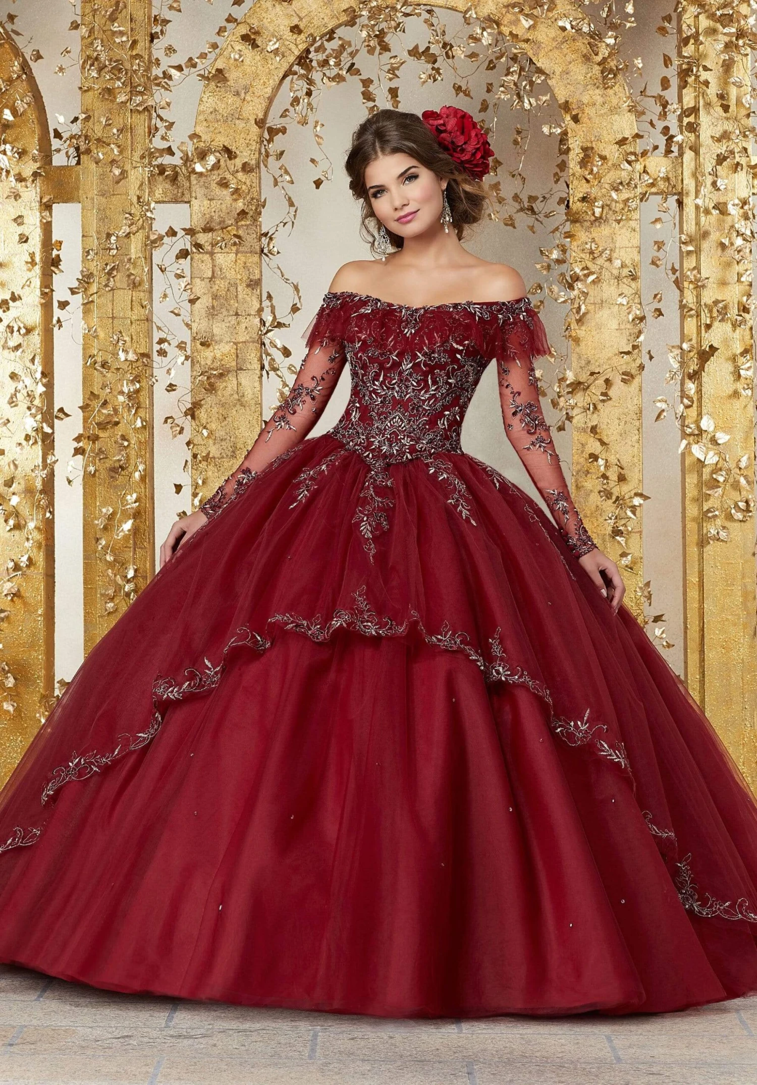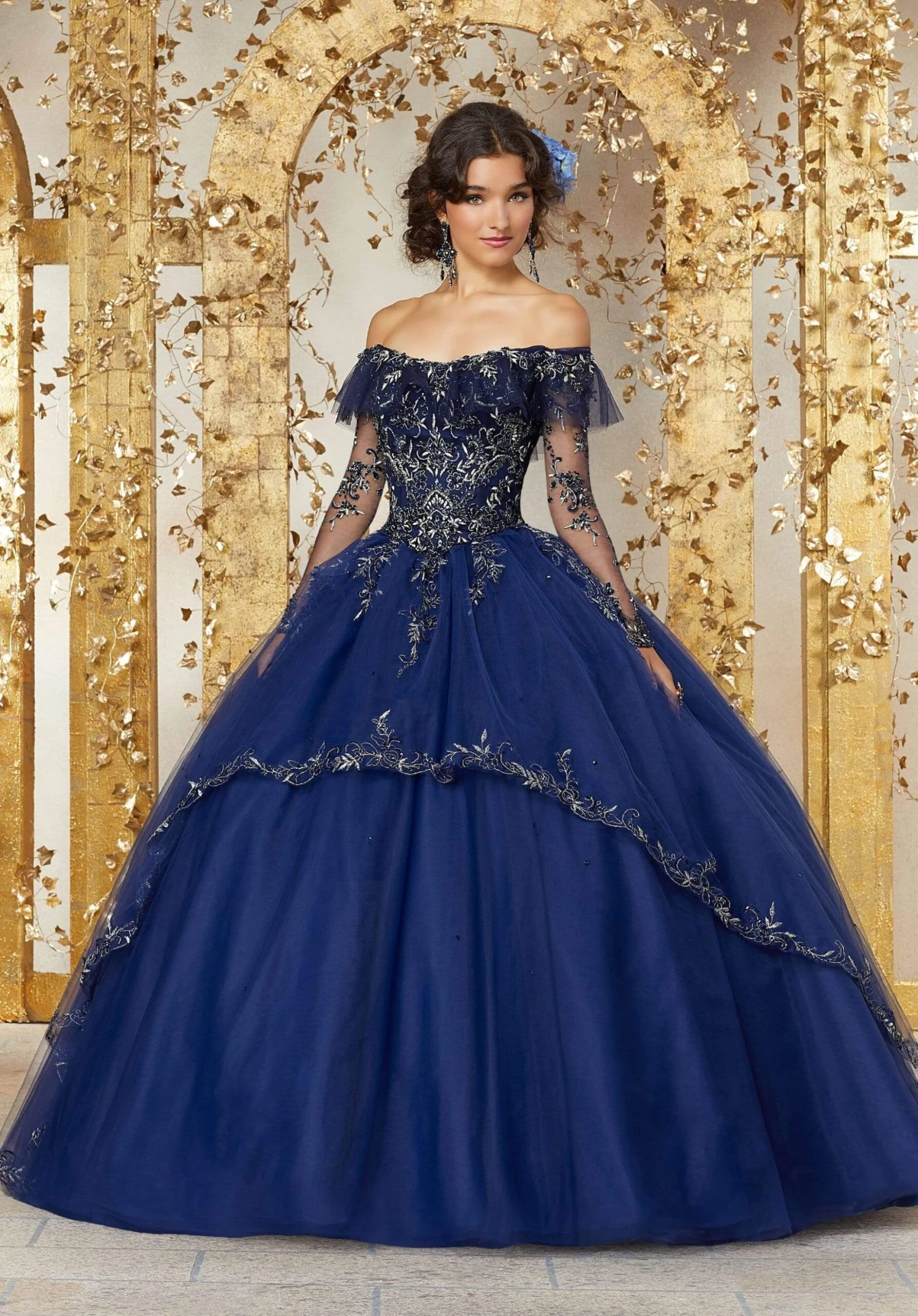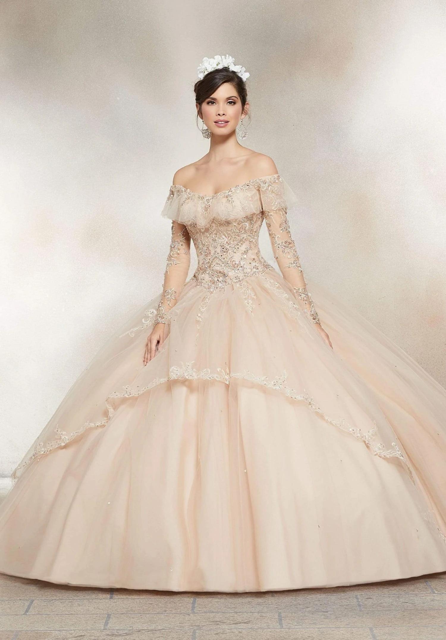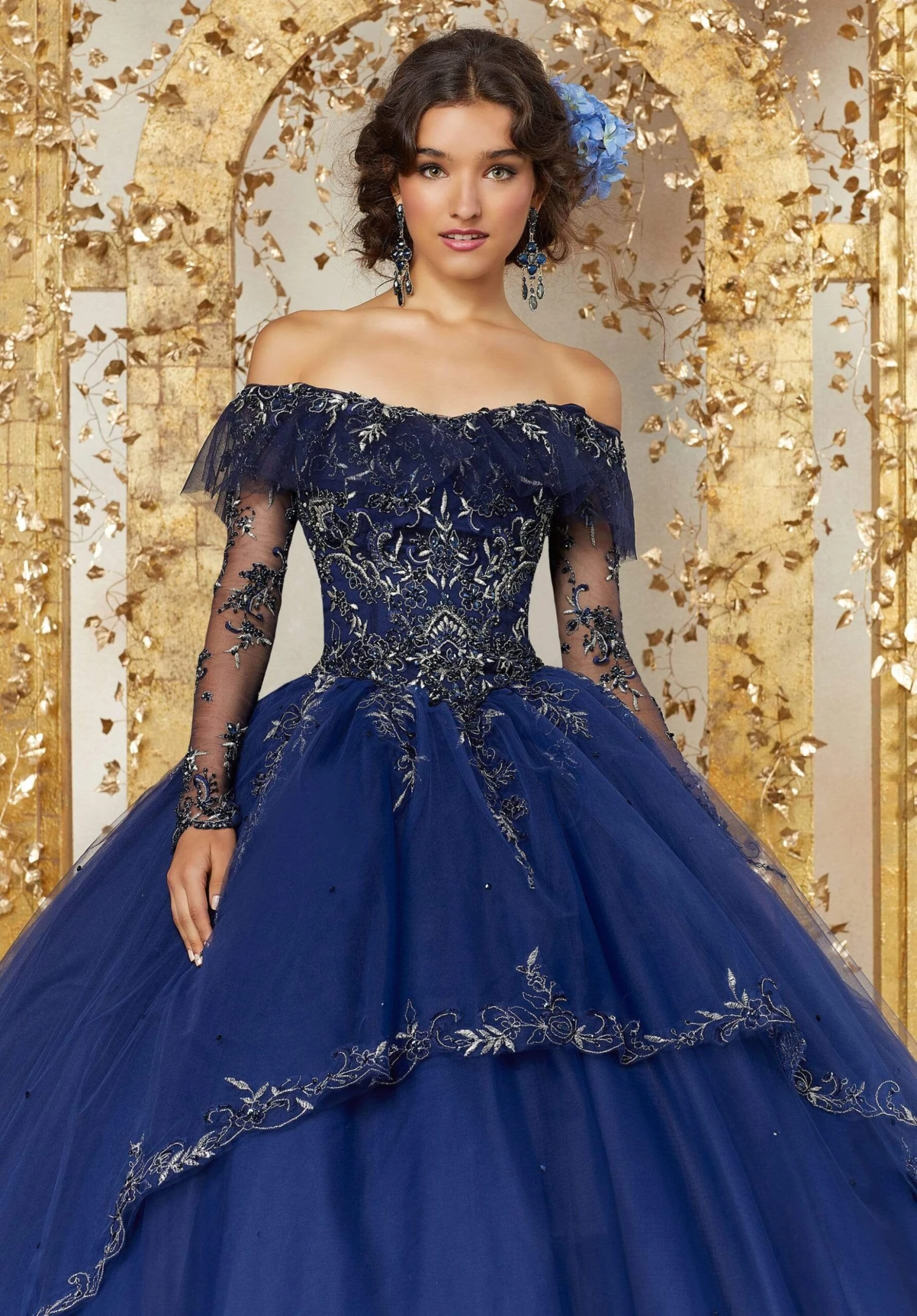 Stand out with a queenly sophistication at your whimsical party with this spectacular creation from Vizcaya by Mori Lee 89235. Beautifully crafted with embroidery details with tonal gem stone beads on a corset style bodice, this dreamy piece shows an off-shoulder neckline with sheer gathered flounce and long slender sheer sleeves with embellished with similar beaded embroidery. The back reveals lace-up detail for that alluring sculpted shape. The ballgown skirt unveils a hi-lo edged overlay and cascade fascinatingly down to a stunning full-length hemline . You’ll definitely be at the center of the spotlight as you glow with beauty in this Vizcaya by Mori Lee masterpiece.
