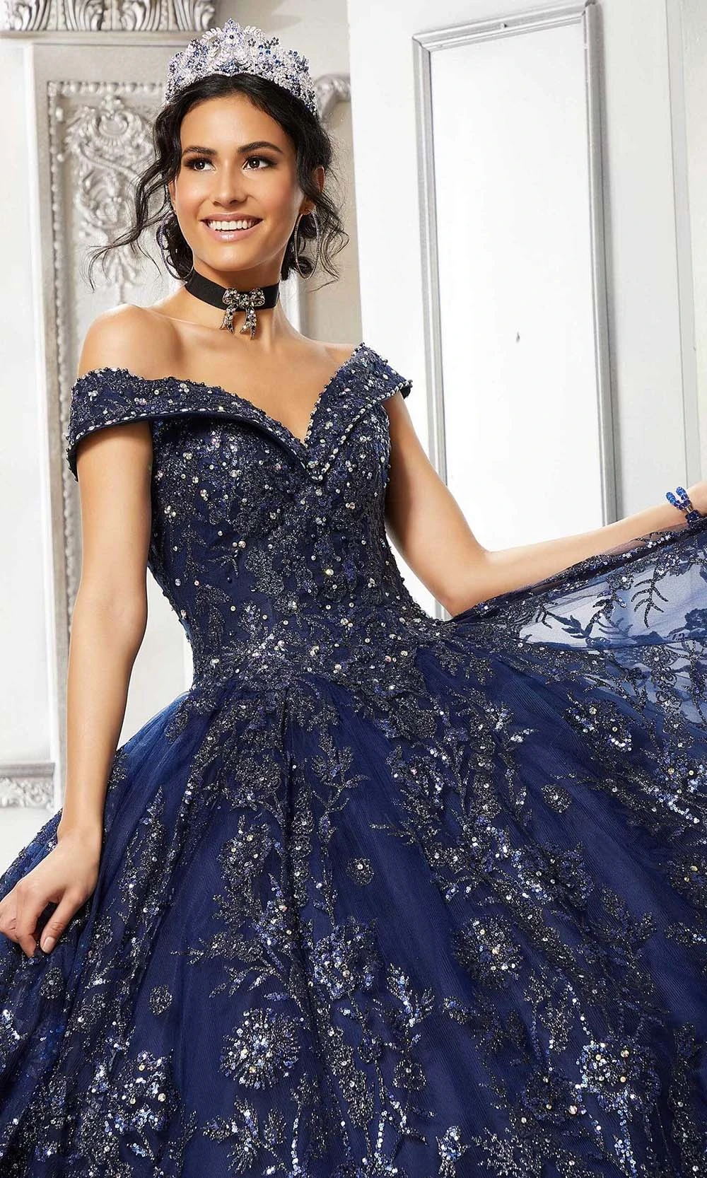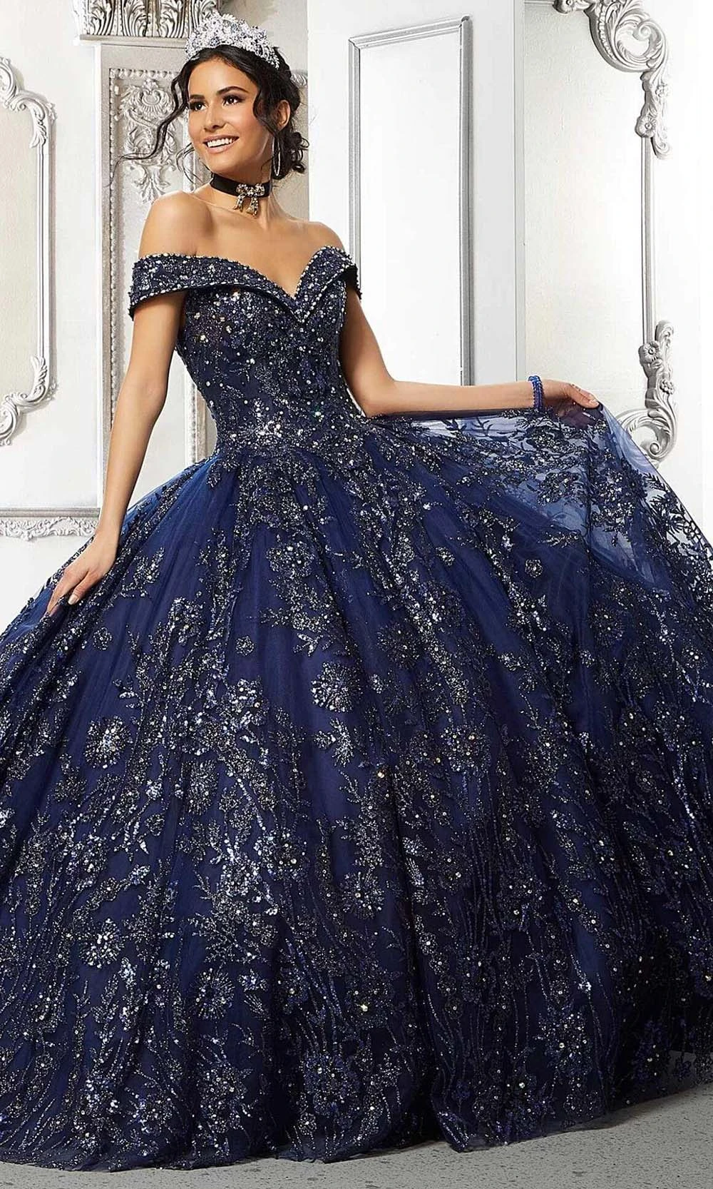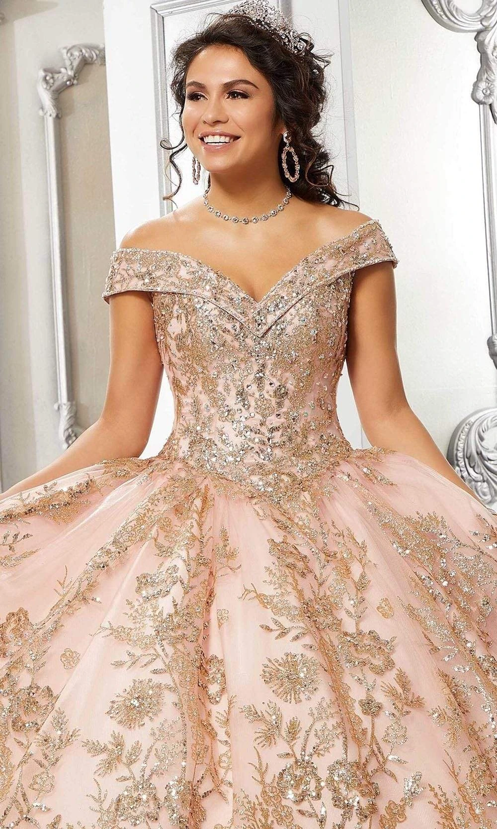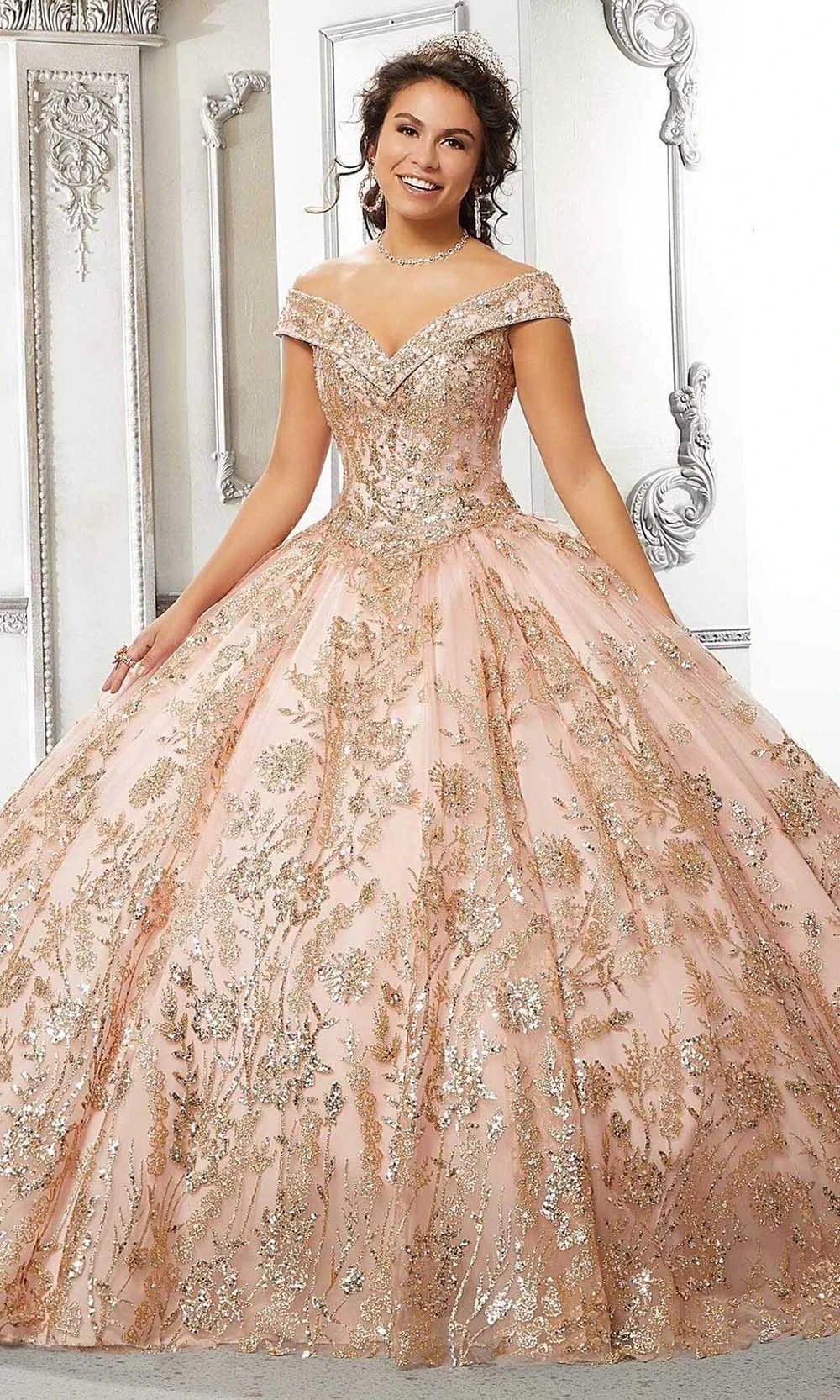 | Details: | Off shoulders, Wide neckline, Tulle, Sequins, Glitters, Voluminous, Lace-up back, Floor length, Sweep train, Quinceanera |