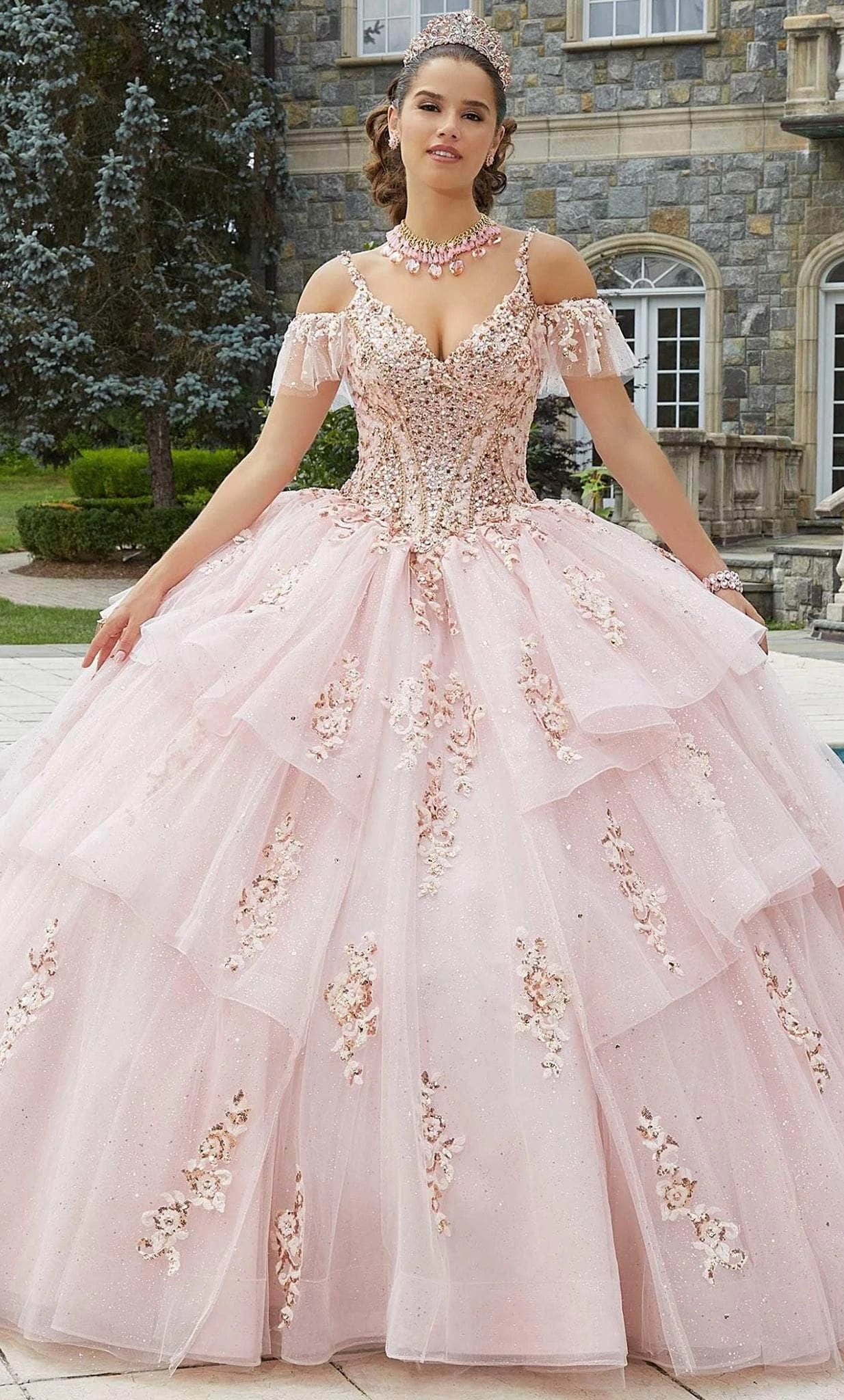 Strike a pose as you enter the room in this exquisite Mori Lee 89402. Bedazzled with rhinestones, sequins, and beads to make sure you don’t dim a light on your special day. The V shape neckline of this dress accentuates the neck, chest, and collar bone. An exquisite ball gown silhouette is tailored with tiers and is showered with glitters allover. Secured at the back with a lace-up tie. Make your perfect day blossom with a promise of forever in this Mori Lee 89402 masterpiece. Model is wearing Blush/Rose Gold color.